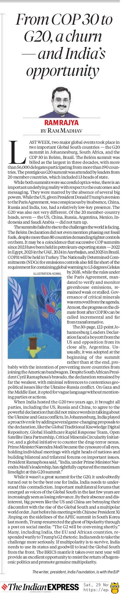 Last week saw two major global events taking place in two important countries in the Global South – the G-20 Summit at Johannesburg in South Africa on November 22-23 and the COP30 at Belem in Brazil on November 10-21. Both were high-profile events dealing with important global issues like trade, wars and environment. COP30 was the 30th session of the UNFCCC, and the 10th session after the Paris Agreement in 2015. Belem summit was billed as the largest in three decades with more than 56000 delegates participating from more than 190 countries. On the other hand, the prestigious G-20 Summit also saw attendance of leaders from 20 member countries that included 13 heads of state.