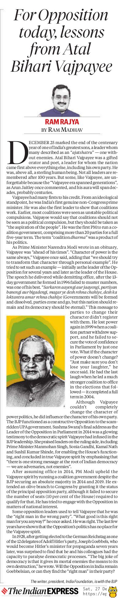 Vajpayee had many firsts to his credit. He was ideologically and politically the first genuinely non-Congress prime minister of the country. He was also the first leader to show that coalitions can work. India entered coalition era in 1989. But most of those coalitions were unstable arrangements born out of political compulsions. Vajpayee used to say that coalitions should not be seen only as a political compulsion, but they should be taken as “the aspiration of the people”. He was the first successful prime minister to run a 23-party coalition government for a full five-year term. His humility, patience to listen, and connect with different sections of the political establishment irrespective of ideological differences made successful functioning of that coalition possible. The phrase “Coalition Dharma” was a product of his politics.