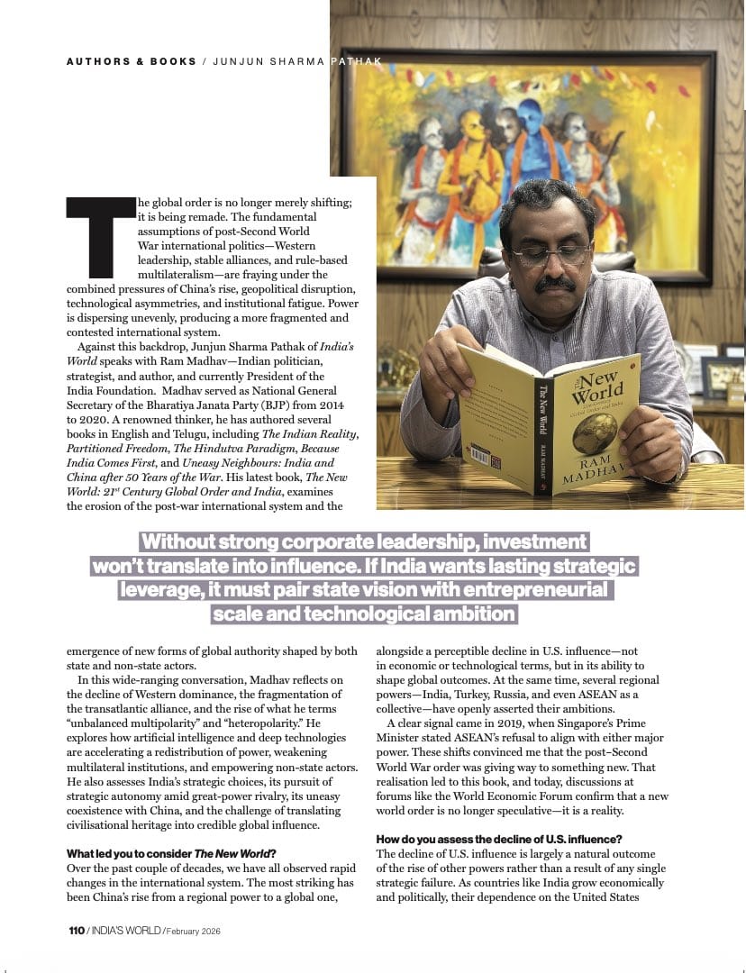 Against this backdrop, Junjun Sharma Pathak of India’s World speaks with Ram Madhav—Indian politician, strategist, and author, and currently President of the India Foundation.  Madhav served as National General Secretary of the Bharatiya Janata Party (BJP) from 2014 to 2020. A renowned thinker, he has authored several books in English and Telugu, including The Indian Reality, Partitioned Freedom, The Hindutva Paradigm, Because India Comes First, and Uneasy Neighbours: India and China after 50 Years of the War. His latest book, The New World; 21st Century Global Order and India, examines the erosion of the post-war international system and the emergence of new forms of global authority shaped by both state and non-state actors.