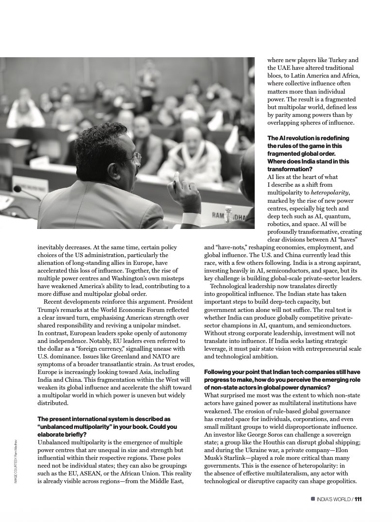 “AI lies at the heart of what I describe as a shift from multipolarity to heteropolarity, marked by the rise of new power centres, especially big tech and deep technologies such as AI, quantum, robotics, and space. AI will be profoundly transformative, creating clear divisions between AI “haves” and “have-nots,” reshaping economies, employment, and global influence. The U.S. and China currently lead this race, with a few others following. India is a strong aspirant, investing heavily in AI, semiconductors, and space, but its key challenge is building global-scale private-sector leaders.”